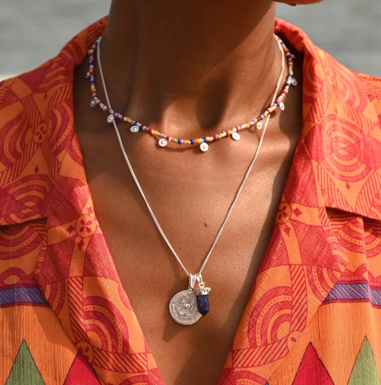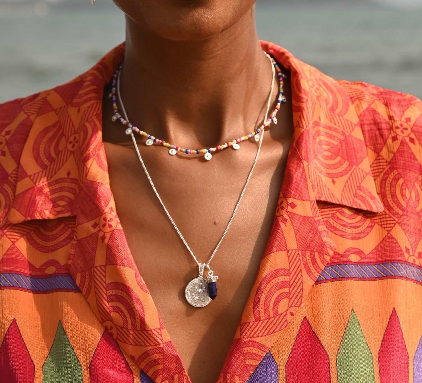 Dainty handcrafted coins hang from a beautiful turquoise, silver bead and delicate pearl choker. Pair with silver layers and sandy toes & imagine you’re sipping from coconuts in Uluwatu...