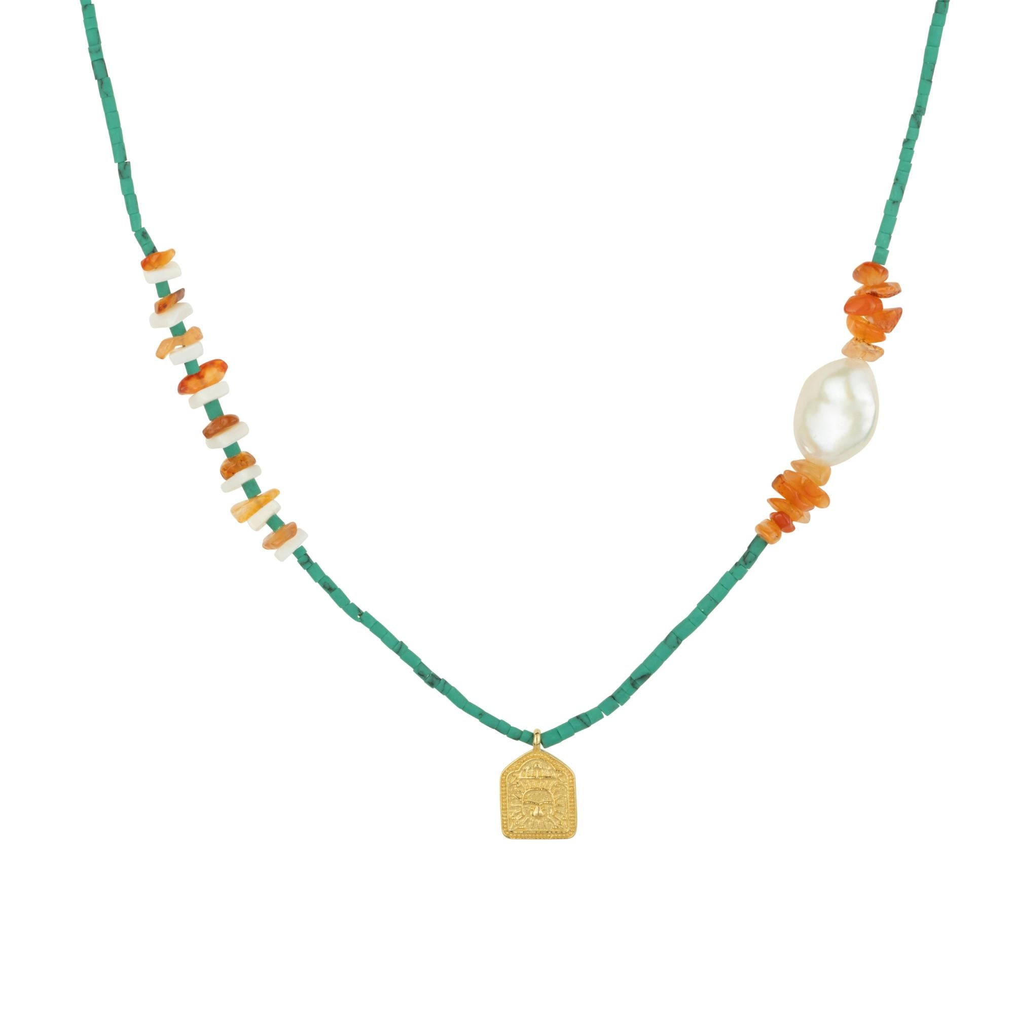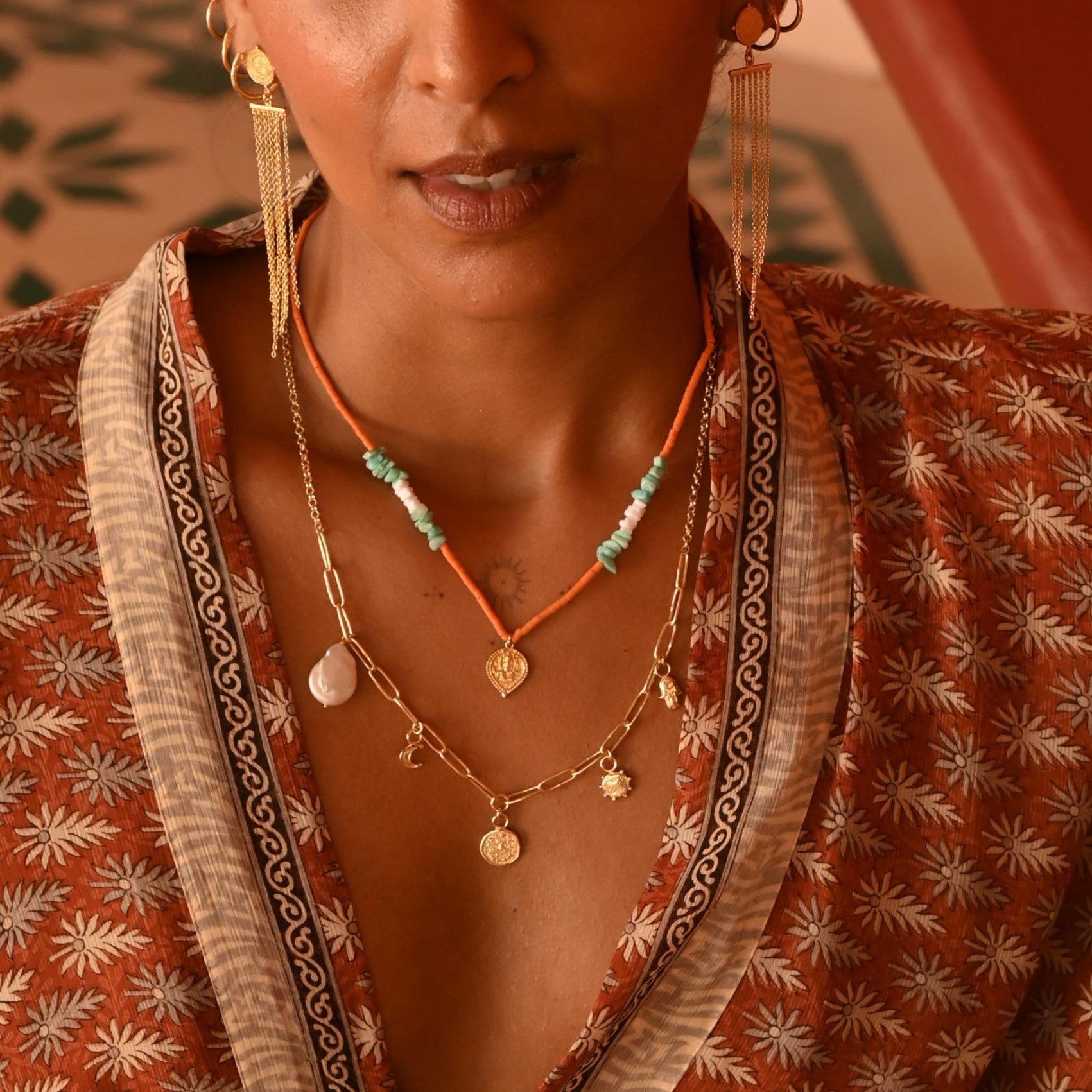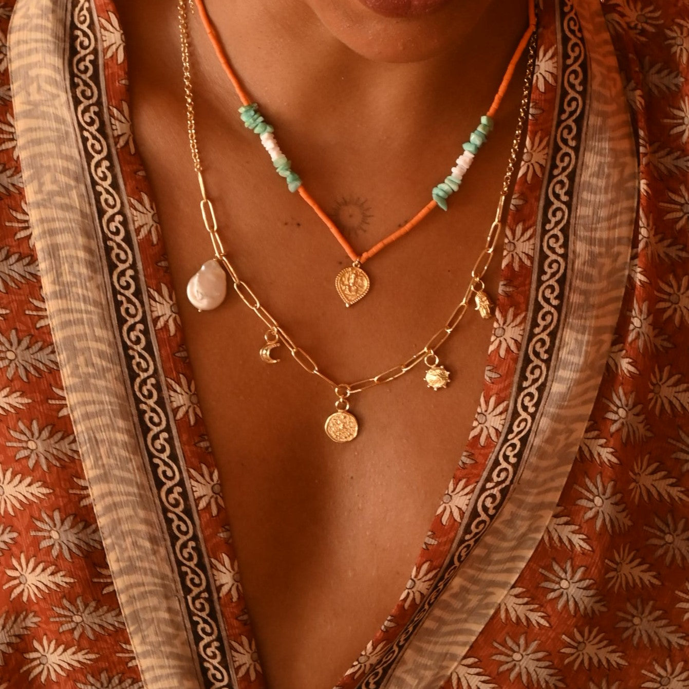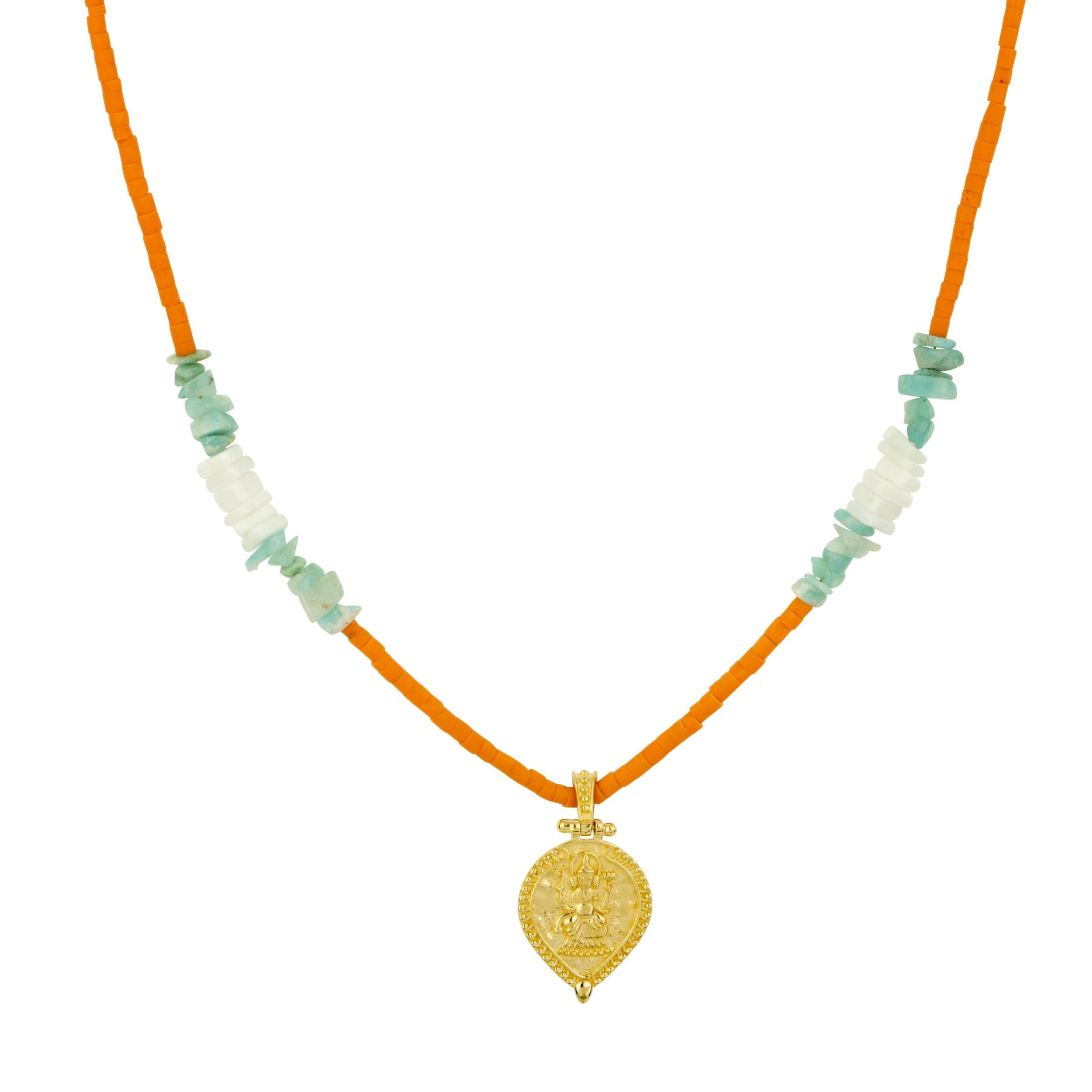 Our best-selling Magic of New Beginnings pendant is updated this season on a playful string of pastel coloured beads, splashed with amazonite & white agate chips.