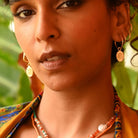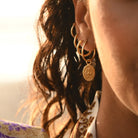 The Hindu goddess Durga, protective mother of the universe and creator of all life, is celebrated in these elegant aged coin hoops.