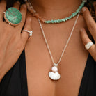 Tumbled turquoise, delicate pink moonstone chips and molten baroque pearls make for this summer’s prettiest neck adornment.