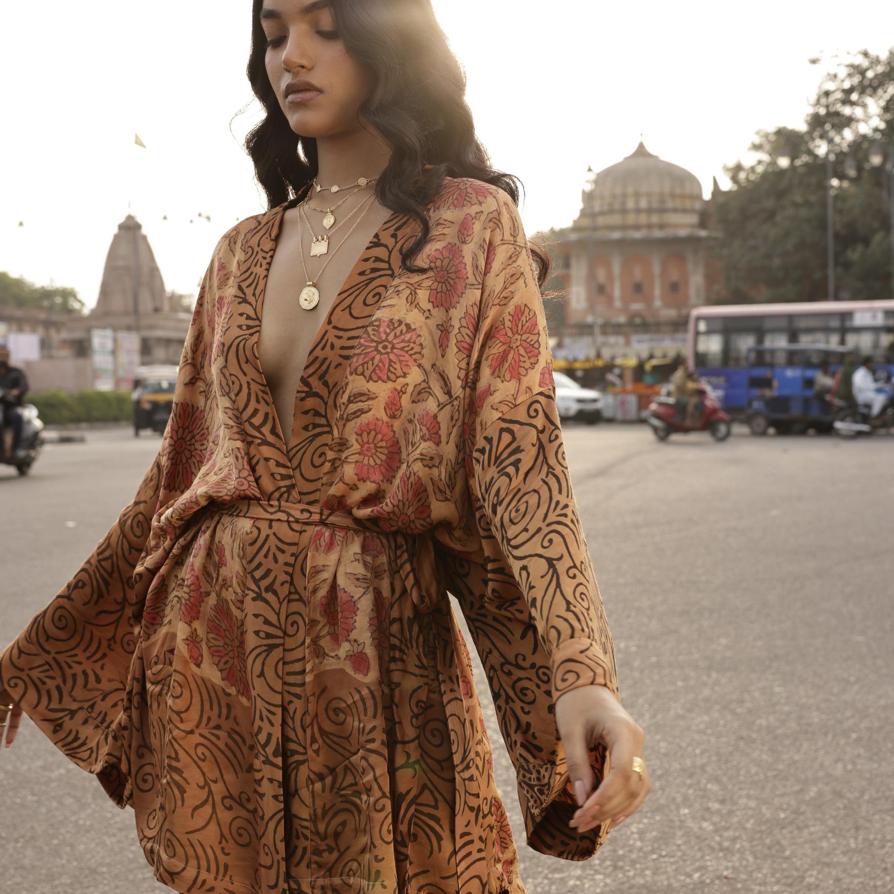 Now reimagined and co-created by empowered female artisans in rural India, the If Saris Could Talk Kimonos are lovingly created from pre-loved saris sourced from all corners of India, and hand-selected for their beautiful prints.Each kimono is one of a kind, no two are the same.