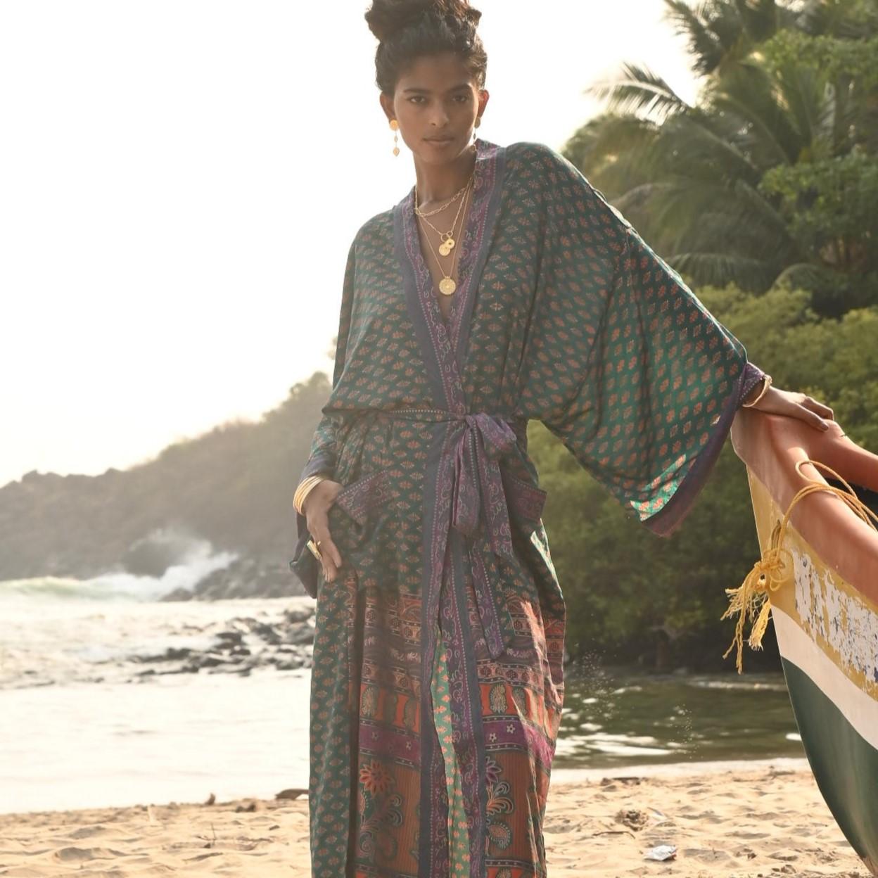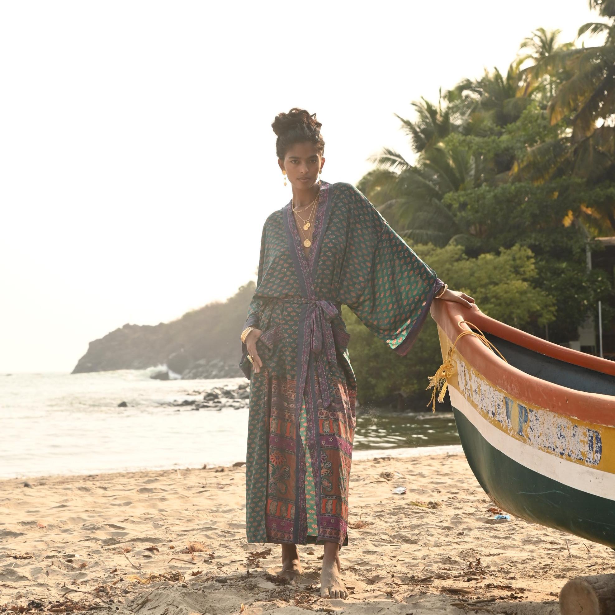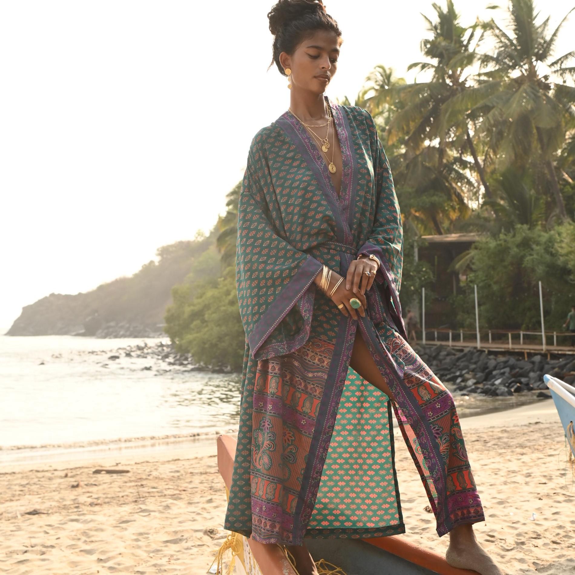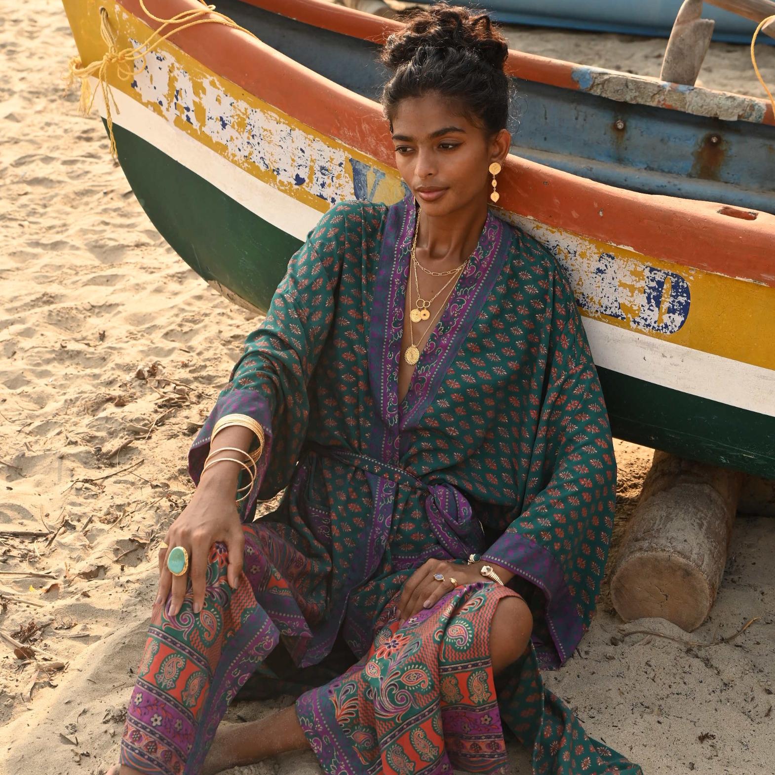 Now reimagined and co-created by empowered female artisans in rural India, our If Saris Could Talk Kimonos are lovingly created from pre-loved saris sourced from all corners of India, and hand-selected for their beautiful prints. Each kimono is one of a kind, no two are the same.