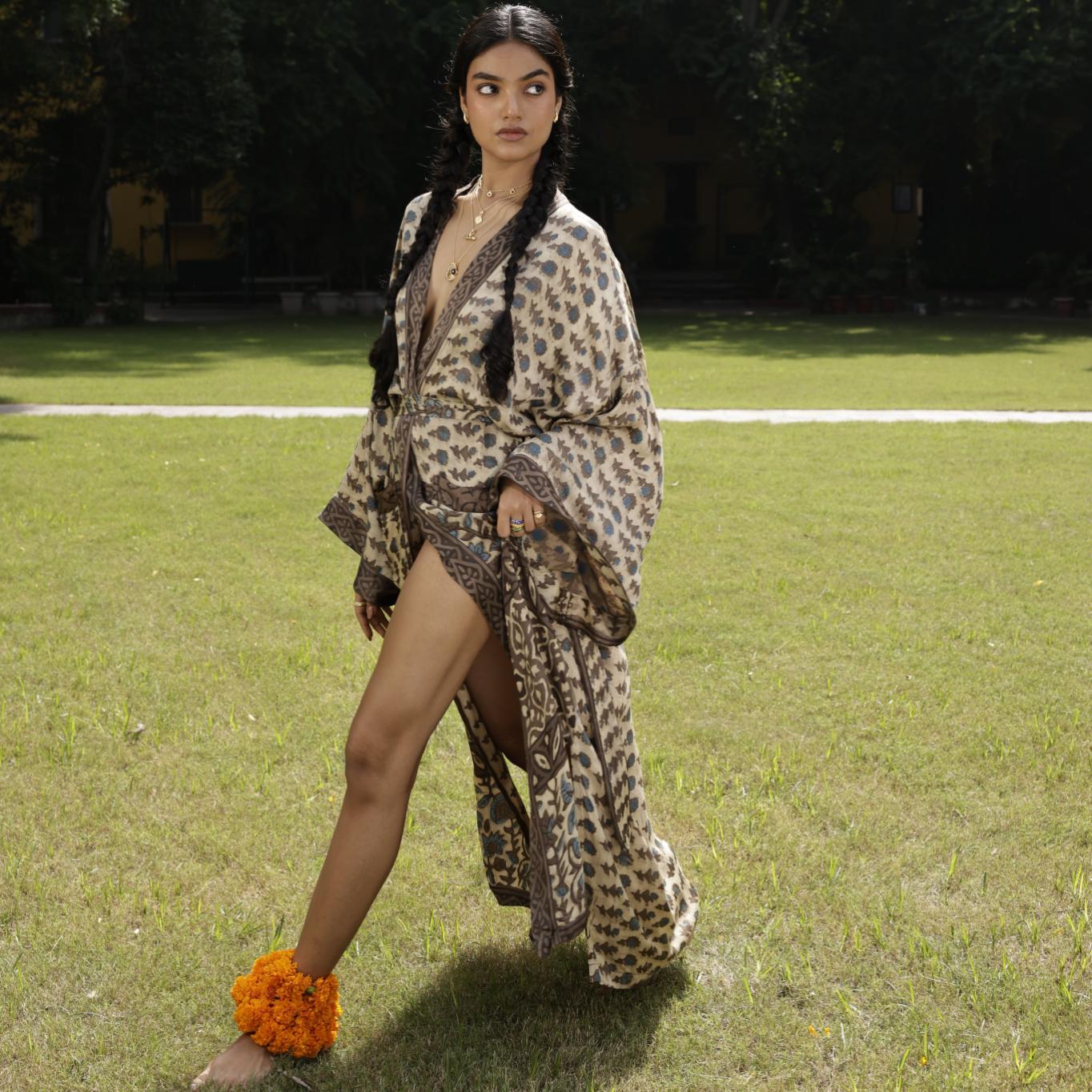 Each kimono is packaged in it’s own individual, hand-embroidered recycled sari drawstring bag, perfect for gifting to a loved one or to self.