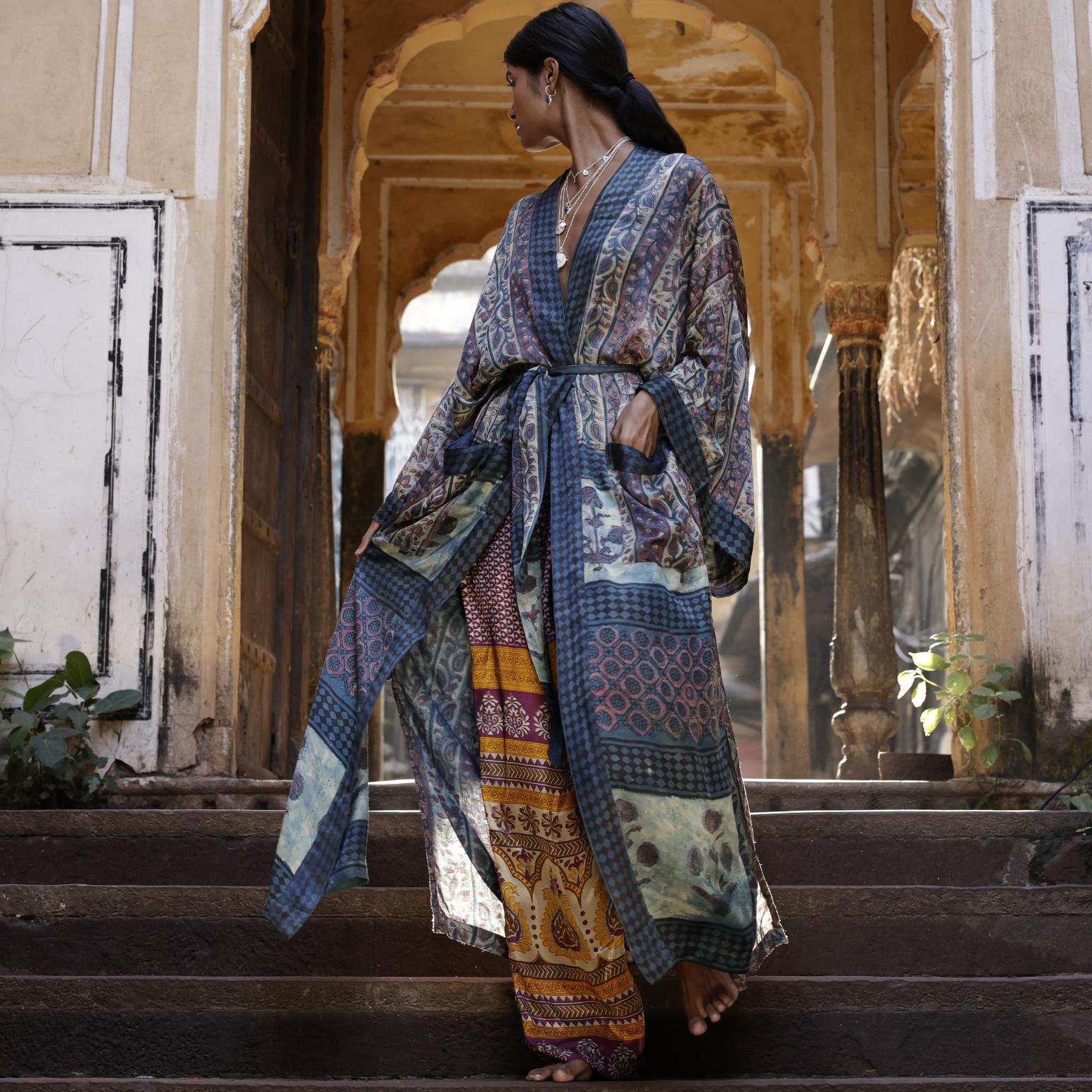 Each kimono is packaged in it’s own individual, hand-embroidered recycled sari drawstring bag, perfect for gifting to a loved one or to self.