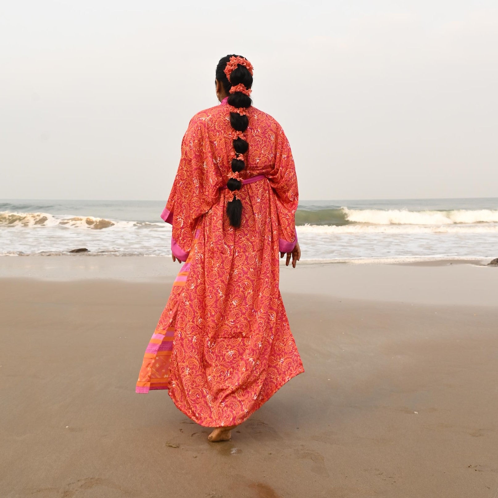 Now reimagined and co-created by empowered female artisans in rural India, our If Saris Could Talk Kimonos are lovingly created from pre-loved saris sourced from all corners of India, and hand-selected for their beautiful prints. Each kimono is one of a kind, no two are the same.