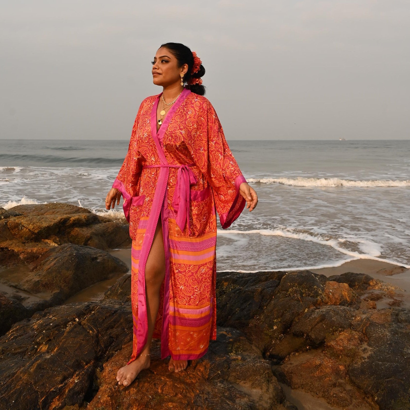 Each kimono is packaged in it’s own individual, hand-embroidered recycled sari drawstring bag, perfect for gifting to a loved one or to self.