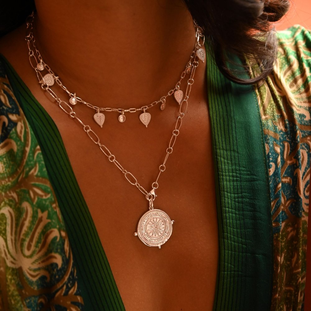 CHARM ONLY. Imagery shows how charm can be styled on a chain or pendant.