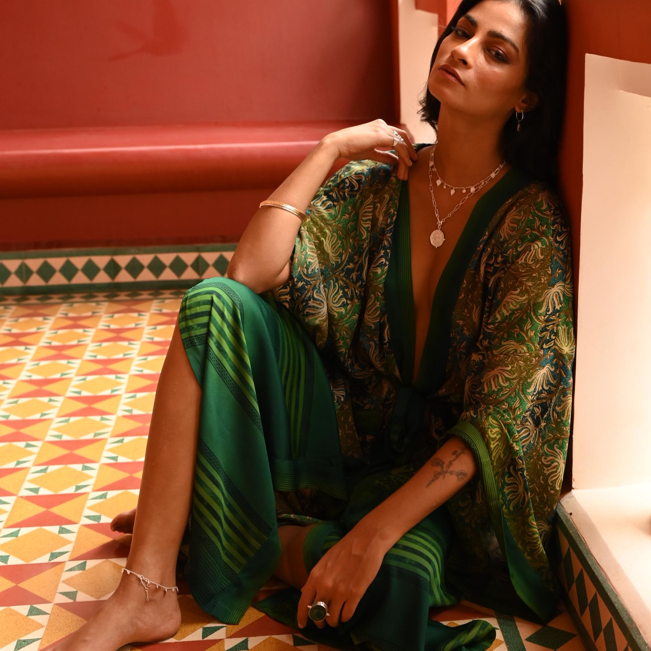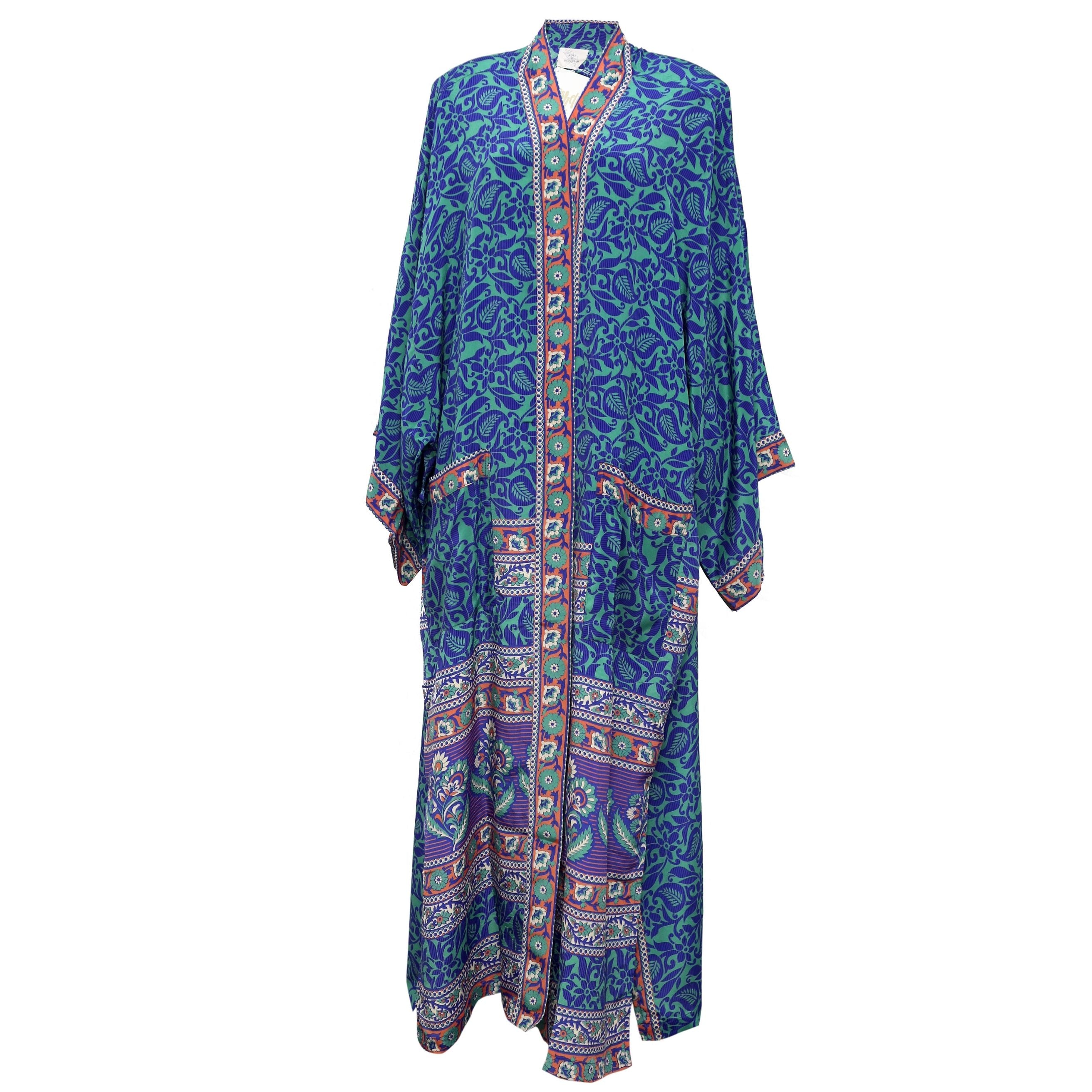 Now reimagined and co-created by empowered female artisans in rural India, our If Saris Could Talk Kimonos are lovingly created from pre-loved saris sourced from all corners of India, and hand-selected for their beautiful prints. Each kimono is one of a kind, no two are the same.