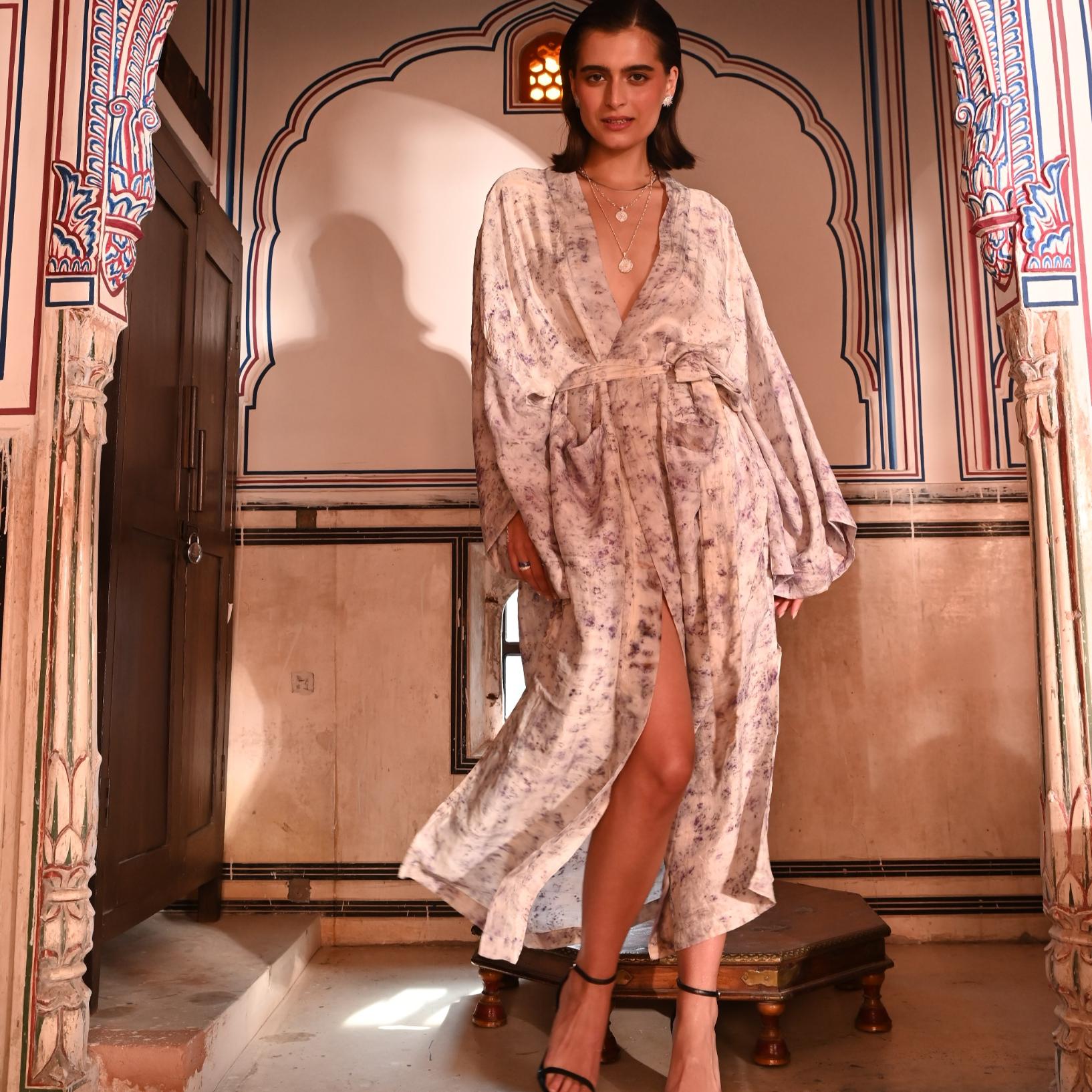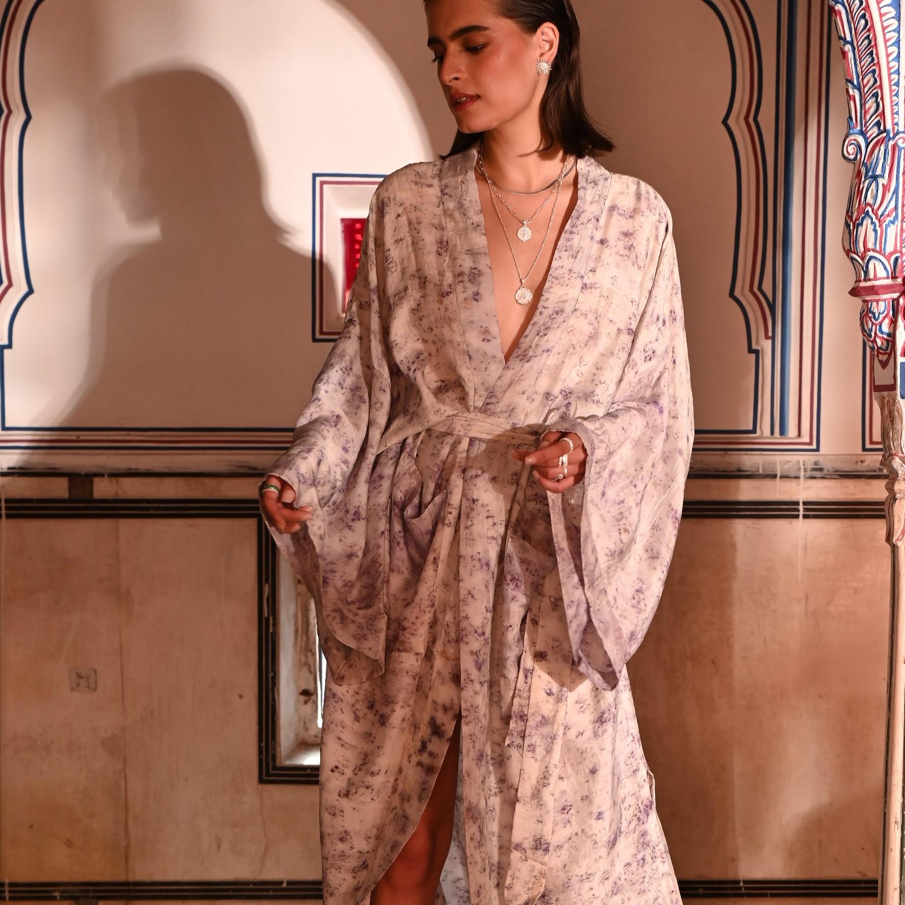 Silk Eco Print Maxi Kimono- Lavender Cloud