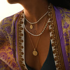 This radiant coin pendant depicts Tara, goddess of compassion, protection & wisdom, celebrated in Hinduism & a most adored goddess in Buddhism.
