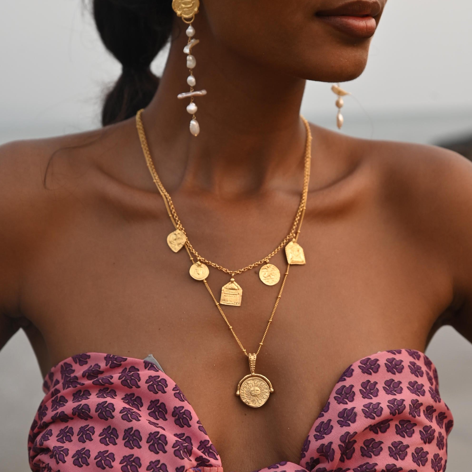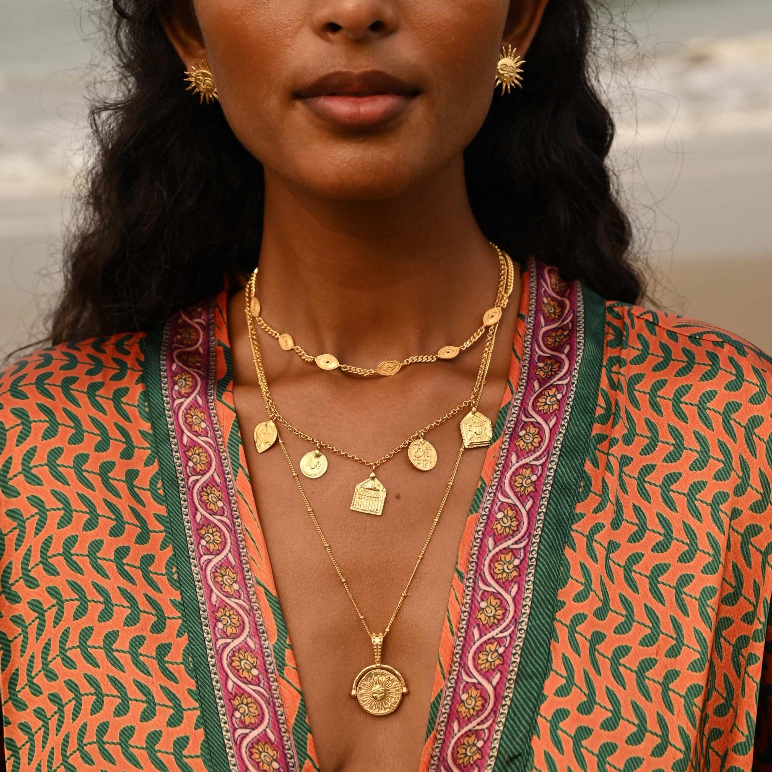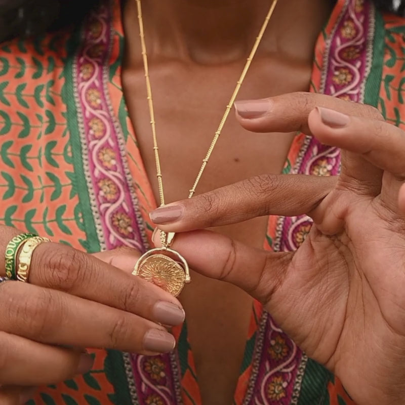 Styling note: There are 4 possible ways to wear the pendant- moon left, moon right, sun up & sun down. Ensure the position of the sun is facing upwards when facing away from the body, this way your sun will always fall in the correct position as you spin it when worn.