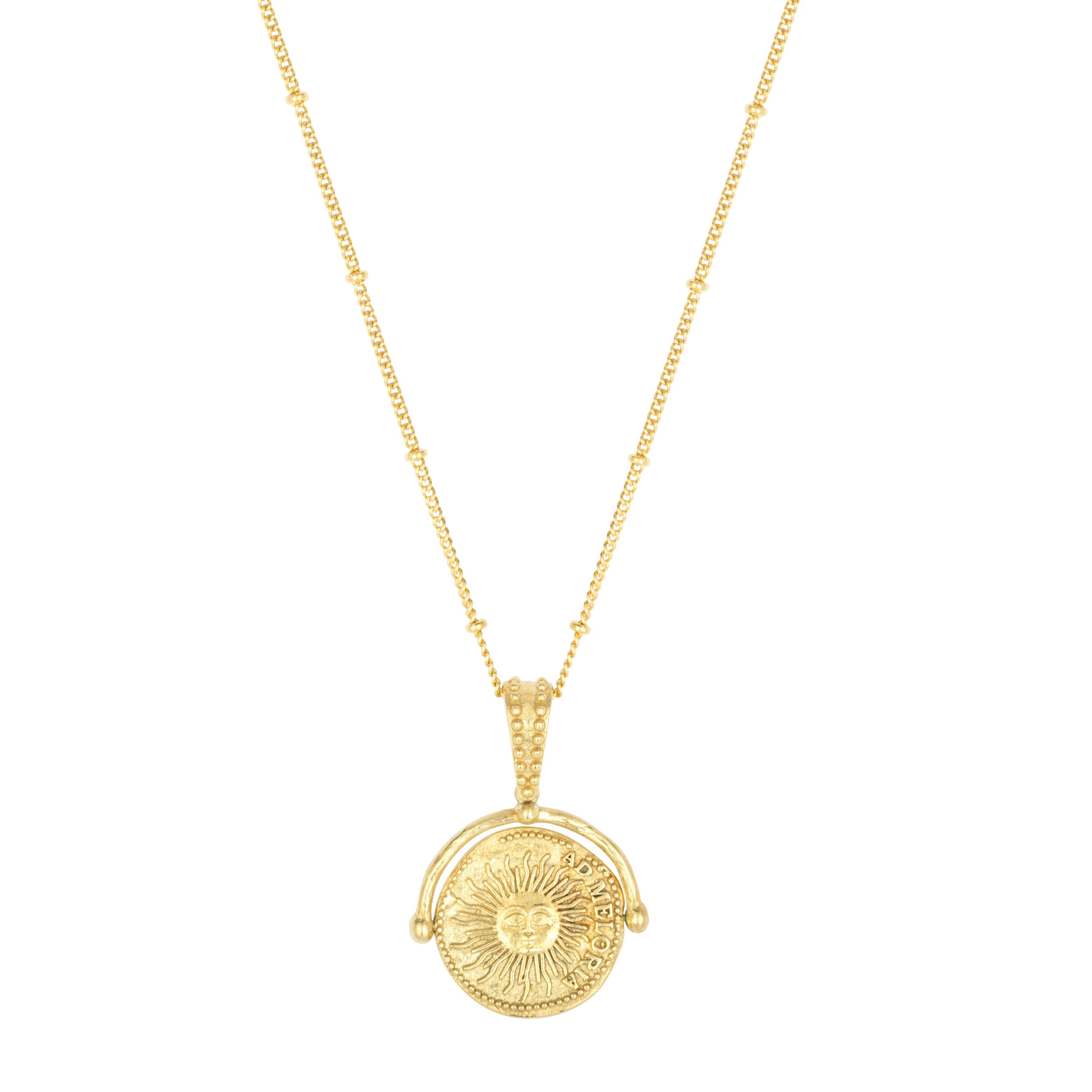 Turn the pendant over to reveal brighter days ahead. Our radiant sun beams the words Ad Meloria (towards better things), bringing endless possibilities with each breaking of the dawn.