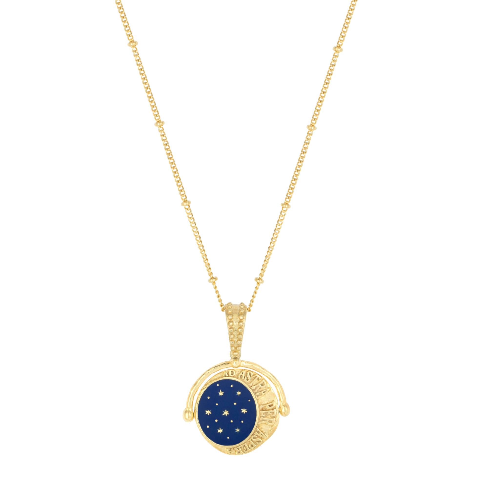 Our enchanting spinner pendant is here to remind you that the night is always darkest before the dawn. A moon against the night sky on one side, the words Ad Astra Per Aspera, Latin for through adversity to the stars, grounds us in the reality that life is often far from perfect. But just like the moon, we are never stuck in one phase, moments will pass.