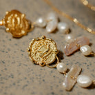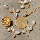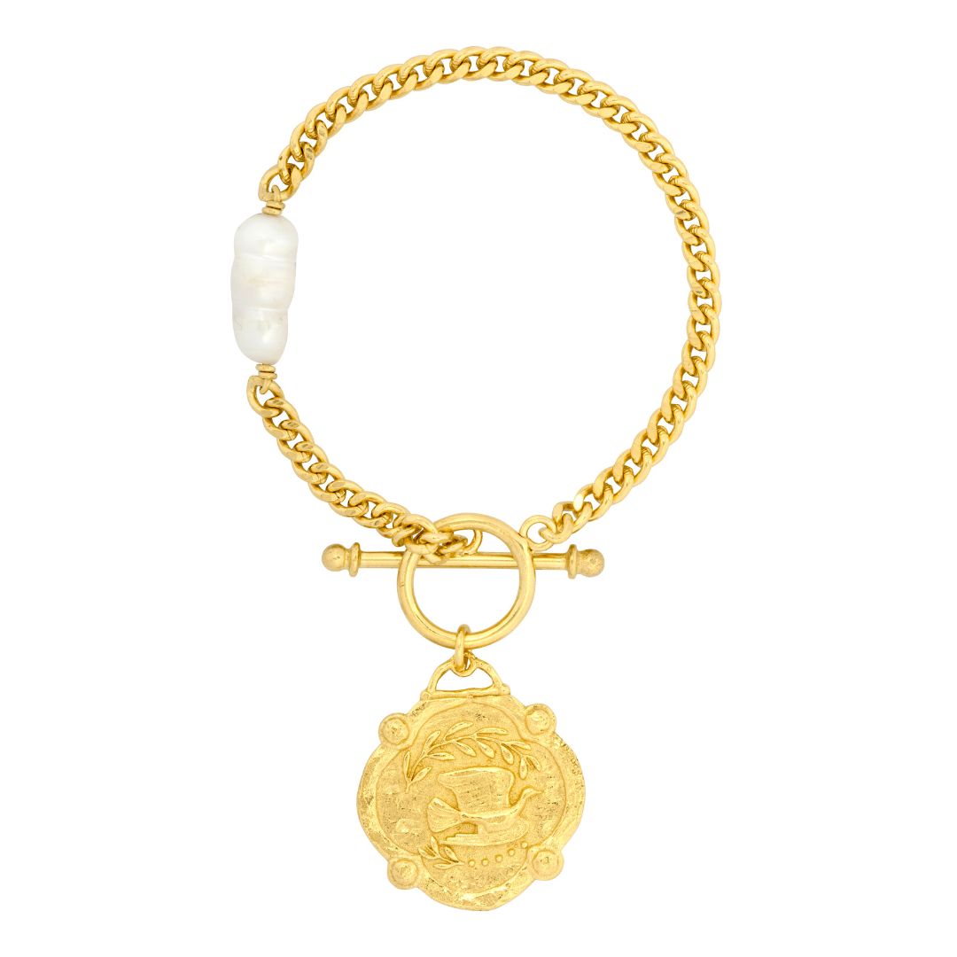 Surrounded by an olive branch, this symbol of peace is made even more striking by the cascade of baroque pearls which fall below it.