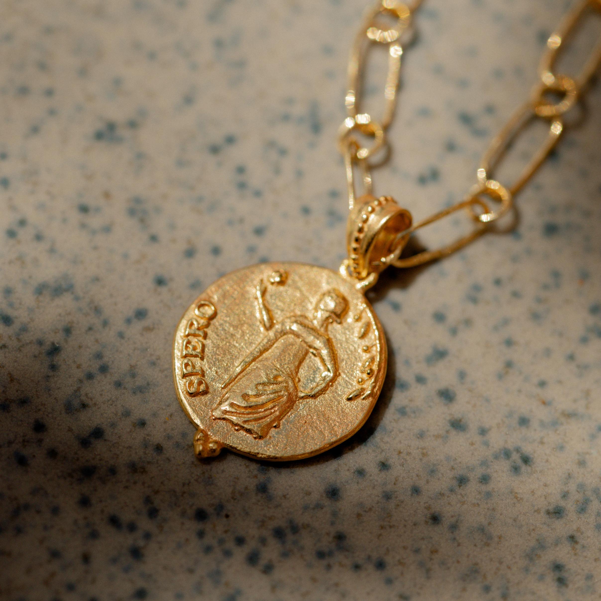 According to Greek mythology, when Pandora's box was opened, releasing all the troubles of the world, the only thing to remain inside the box, was hope, otherwise known as Elpis. There are many interpretations of this myth, but our radiant goddess, surrounded by an olive branch and the Latin word for hope, Spero, serves as our reminder to always hold on to hope.