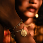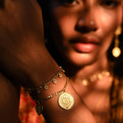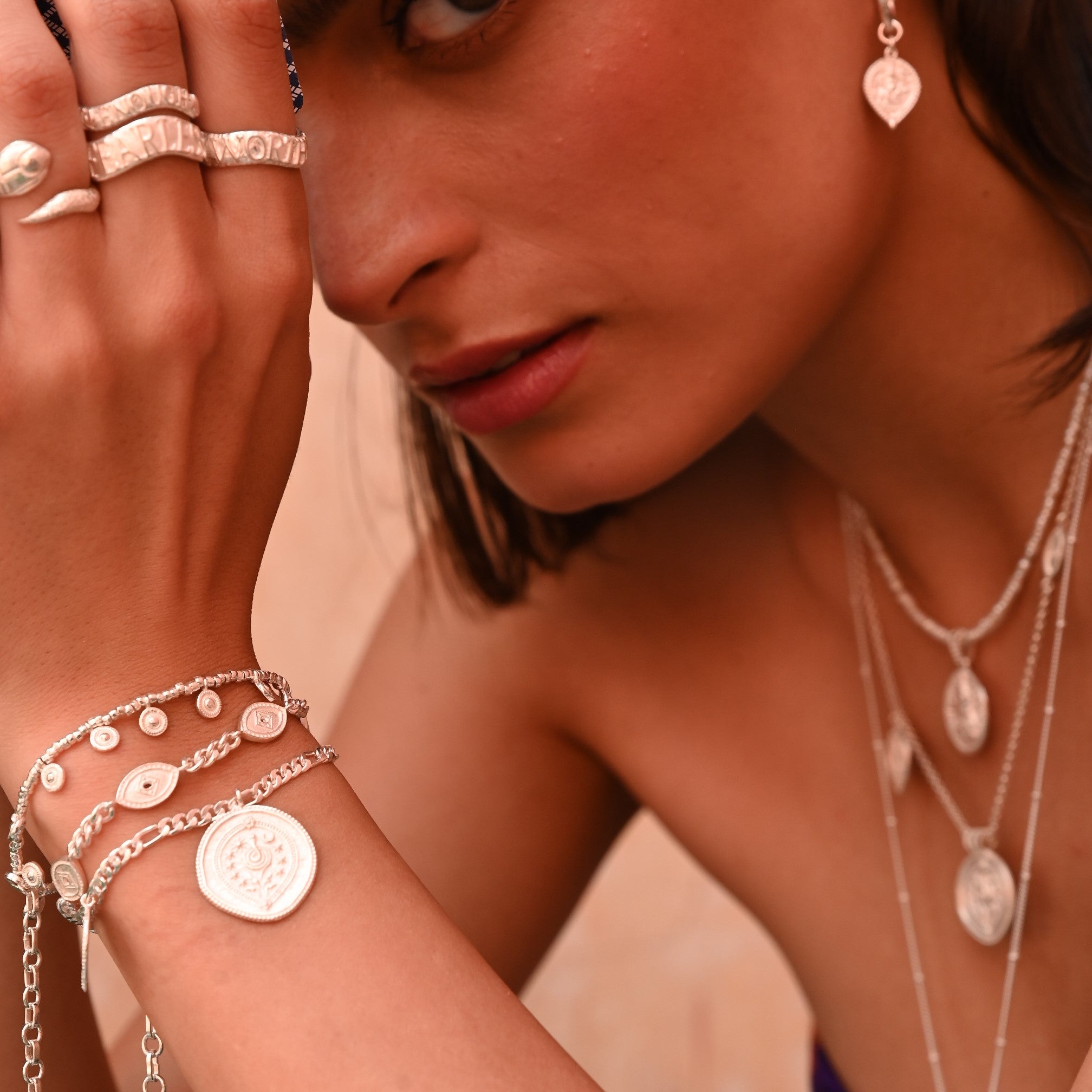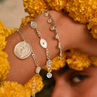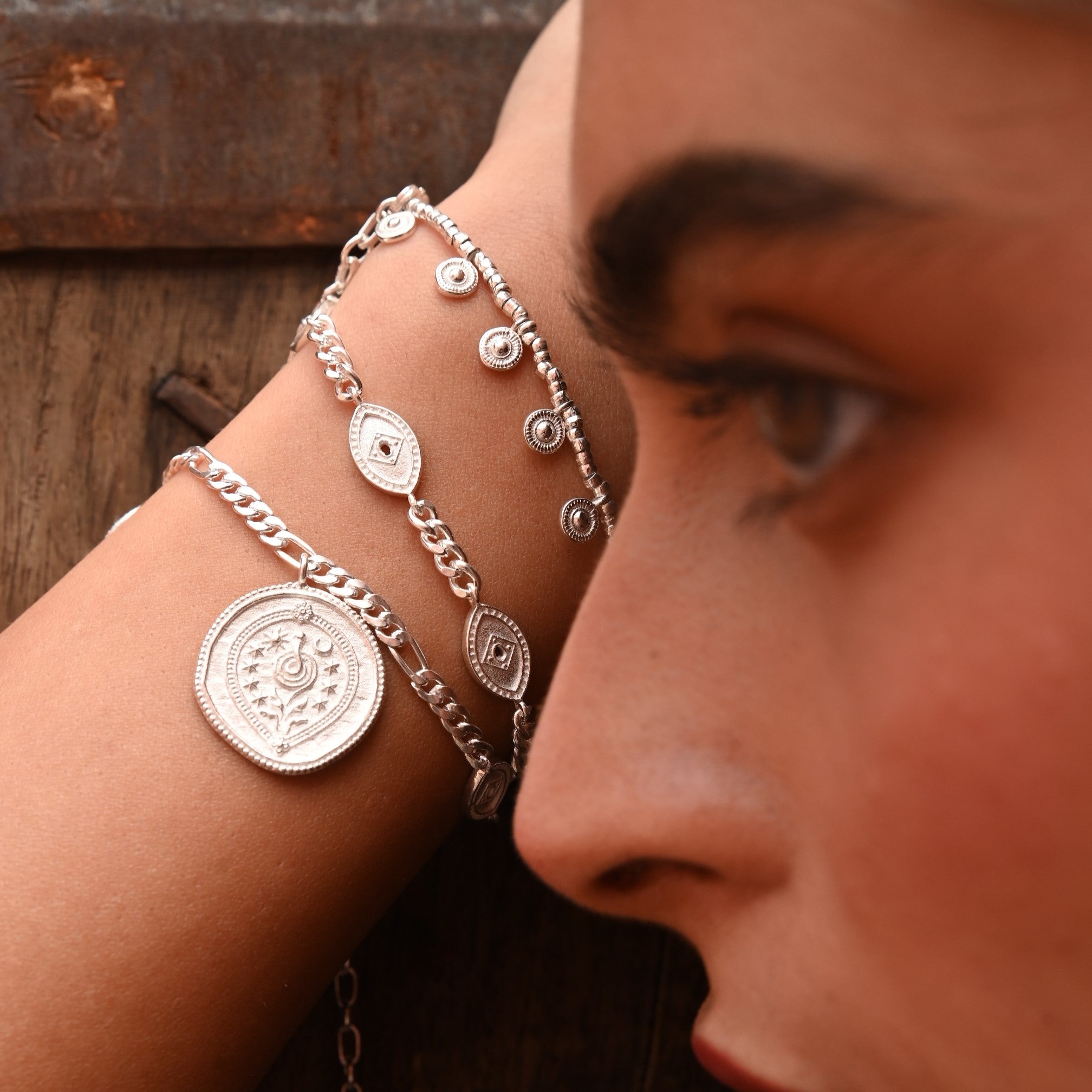 Take a journey through life & self with our lustrous Me, Myself & Eye bracelet, featuring a serpent coin, Unalome teardrop and evil eye charm.