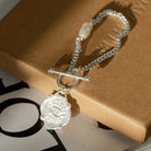 Surrounded by an olive branch, this symbol of peace hangs from a vintage inspired bail on a luxurious curb chain decorated with a baroque pearl.