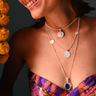 This radiant coin pendant depicts Tara, goddess of compassion, protection & wisdom, celebrated in Hinduism & a most adored goddess in Buddhism.