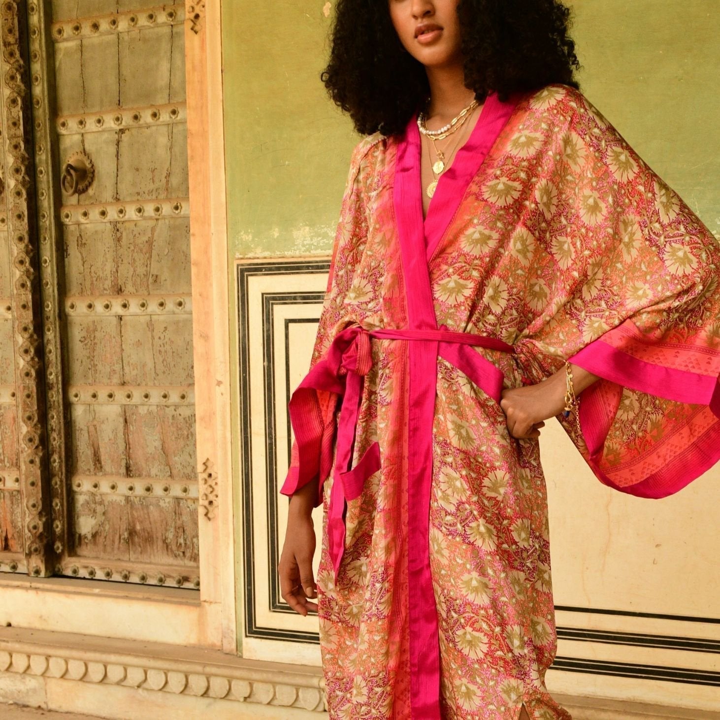 Now reimagined and co-created by empowered female artisans in rural India, our If Saris Could Talk Kimonos are lovingly created from pre-loved saris sourced from all corners of India, and hand-selected for their beautiful prints. Each kimono is one of a kind, no two are the same.