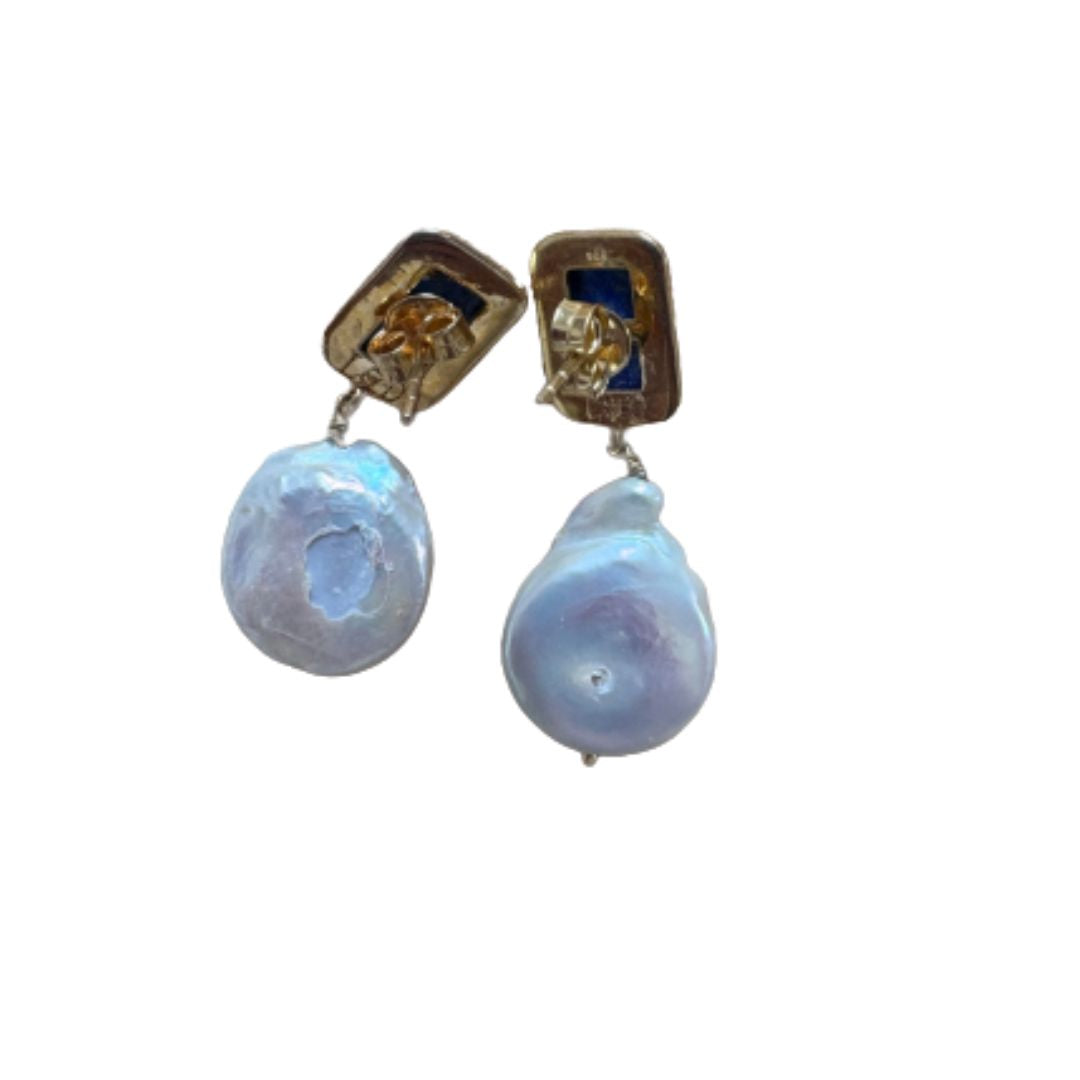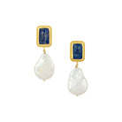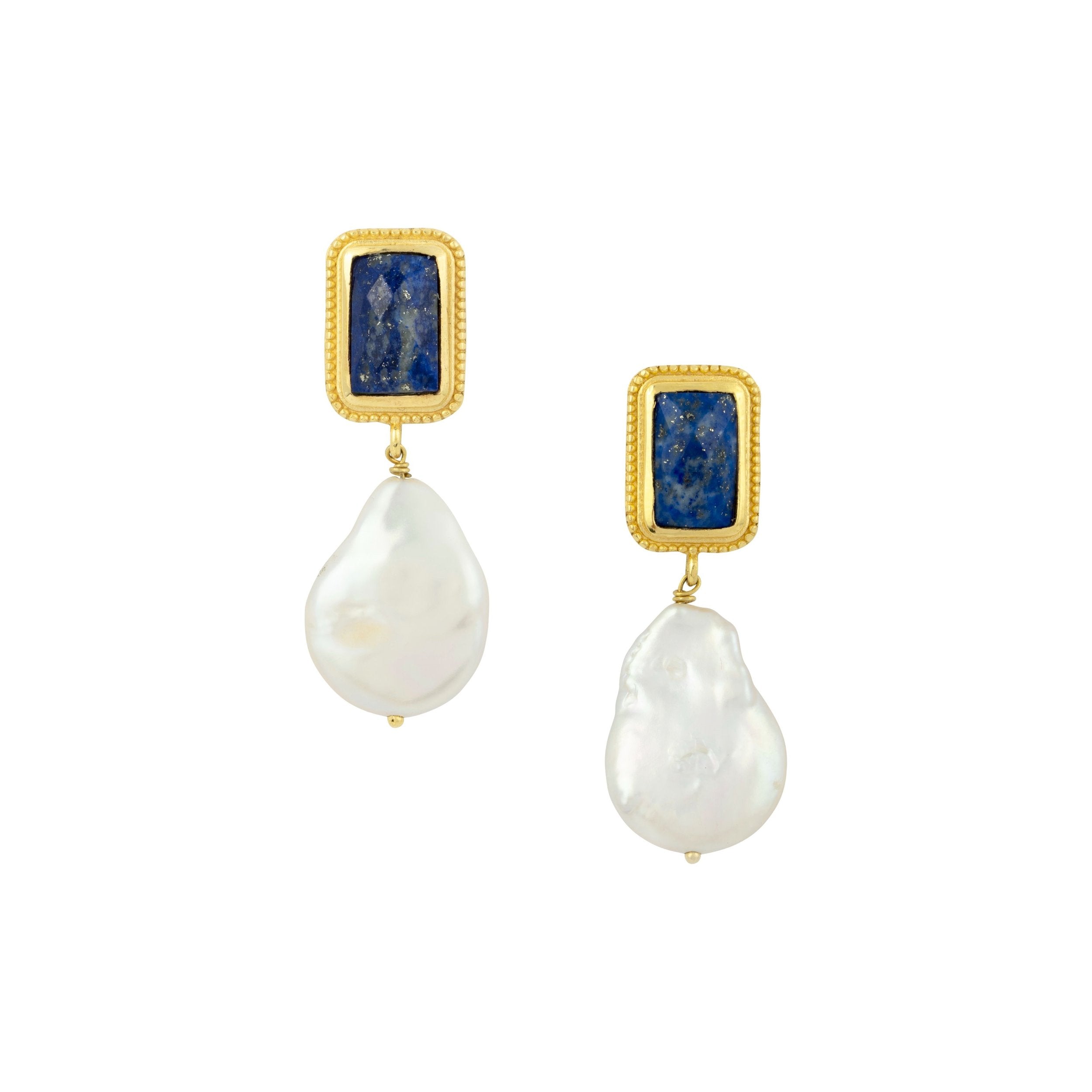 A beautiful baroque pearl hangs from a faceted lapis lazuli stone encased in an antique inspired gold vermeil setting.
