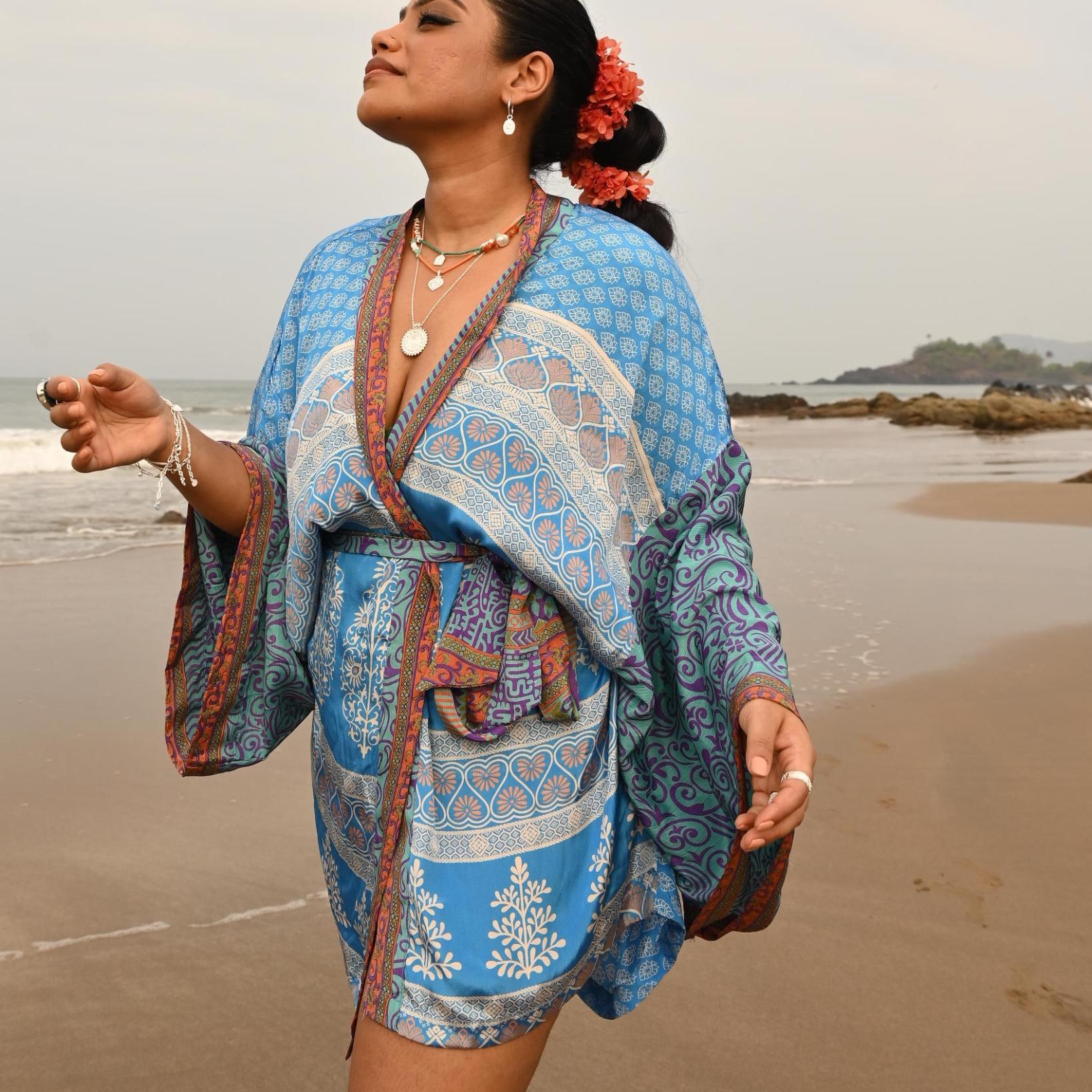 Now reimagined and co-created by empowered female artisans in rural India, the If Saris Could Talk Kimonos are lovingly created from pre-loved saris sourced from all corners of India, and hand-selected for their beautiful prints.Each kimono is one of a kind, no two are the same.