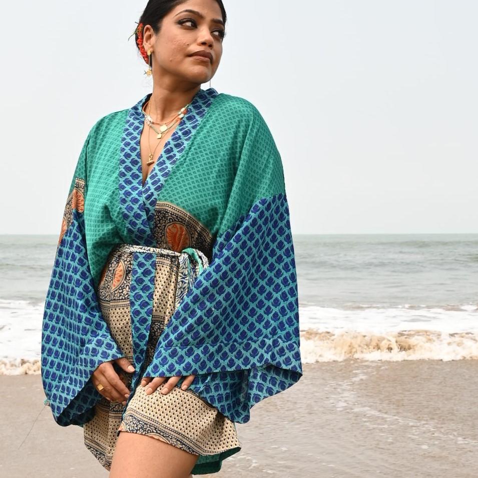 Now reimagined and co-created by empowered female artisans in rural India, the If Saris Could Talk Kimonos are lovingly created from pre-loved saris sourced from all corners of India, and hand-selected for their beautiful prints.Each kimono is one of a kind, no two are the same.