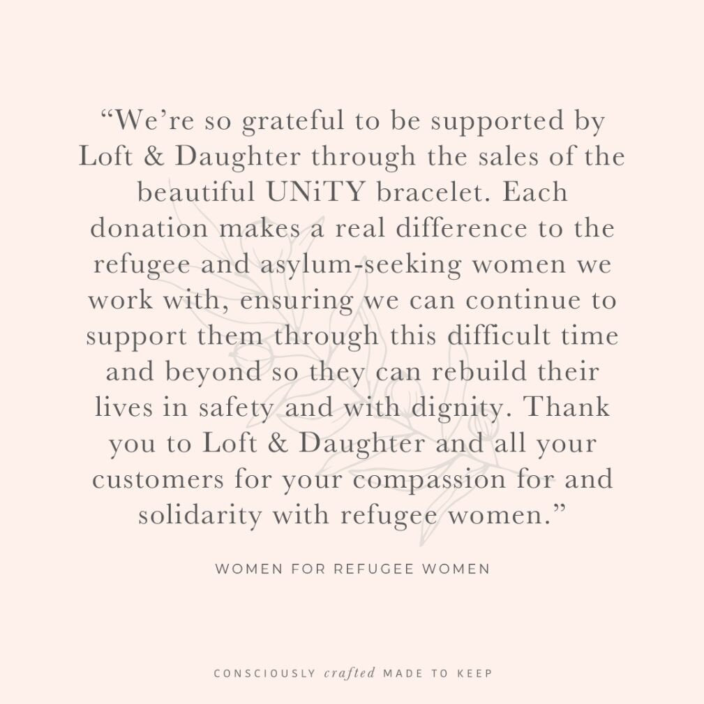 As featured in Stylist Magazine“ You looked at me and said you were not illegal and that you were not coming to the UK for £37 a week. You said you didn’t want anything more than a safe life” ~ @conversationsfromcalais100% of the profits from the UNiTY bracelet will be donated to Women for Refugee Women, a small charity which supports women who are seeking safety in the UK.