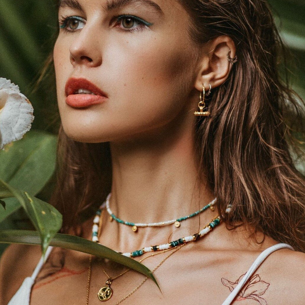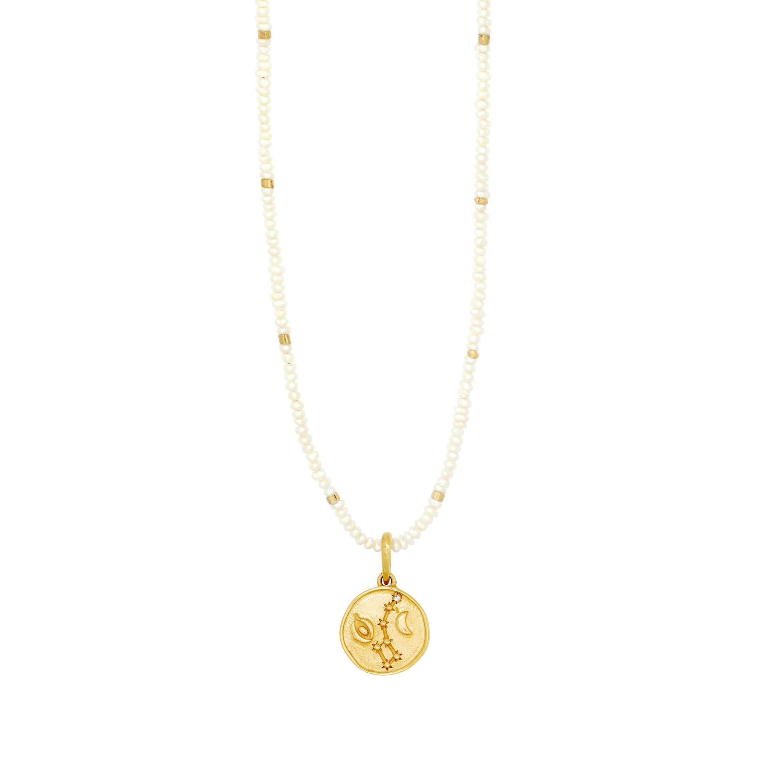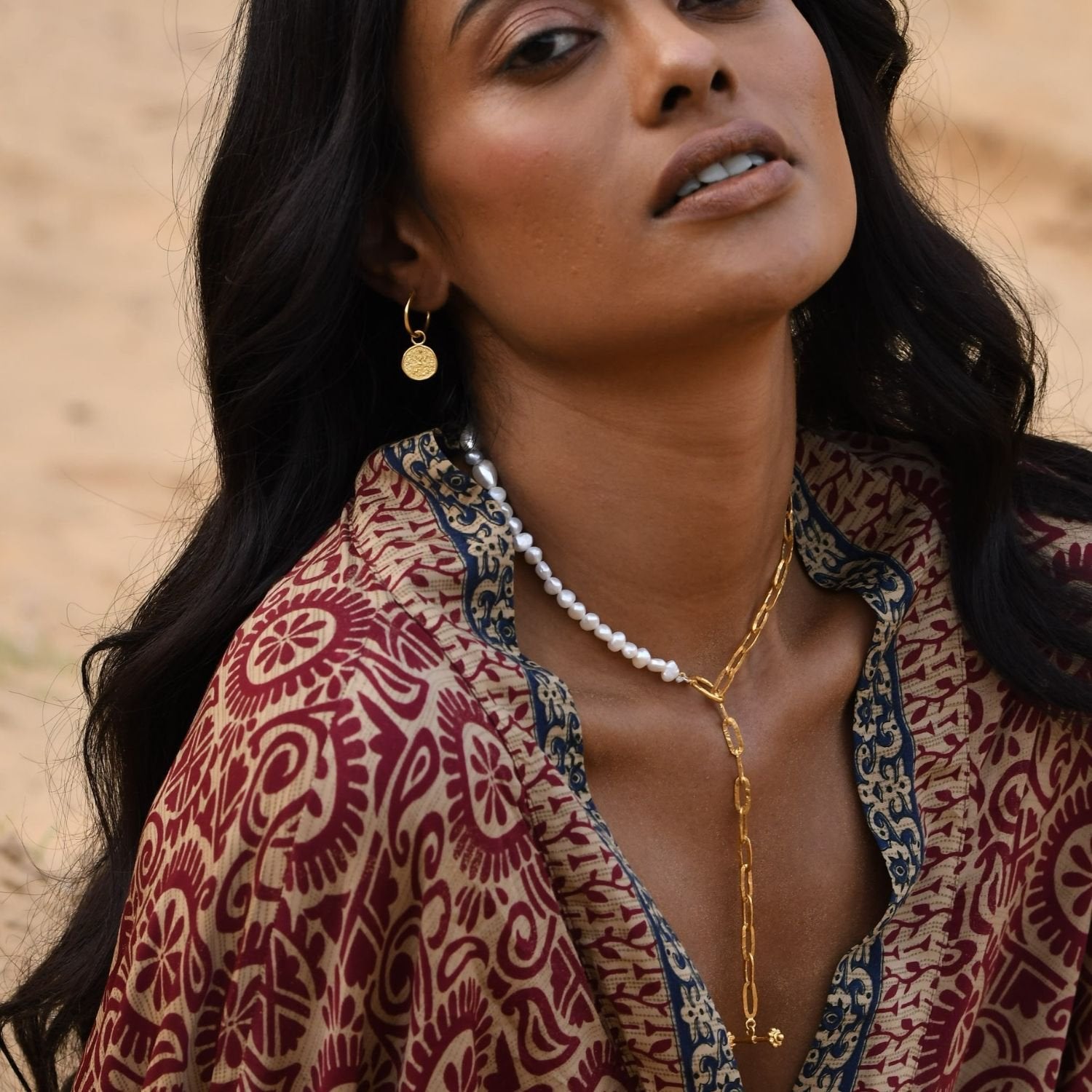 Hung from a string of dainty fresh water pearls peppered with golden beads, this is a fresh way to wear your favourite goddess.