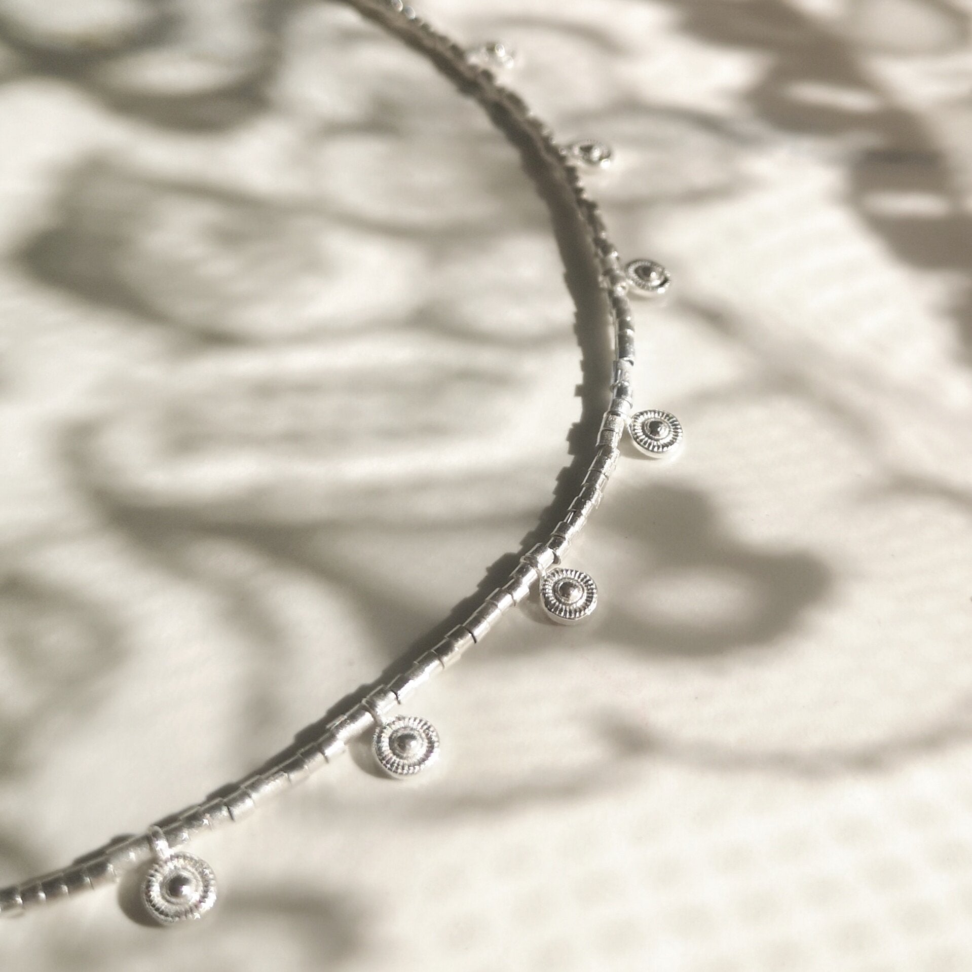 Inspired by the Bishnoi tribespeople of Rajasthan, this mini coin bracelet features 15 dainty charms, which hang from a chain of individually handcrafted beads.