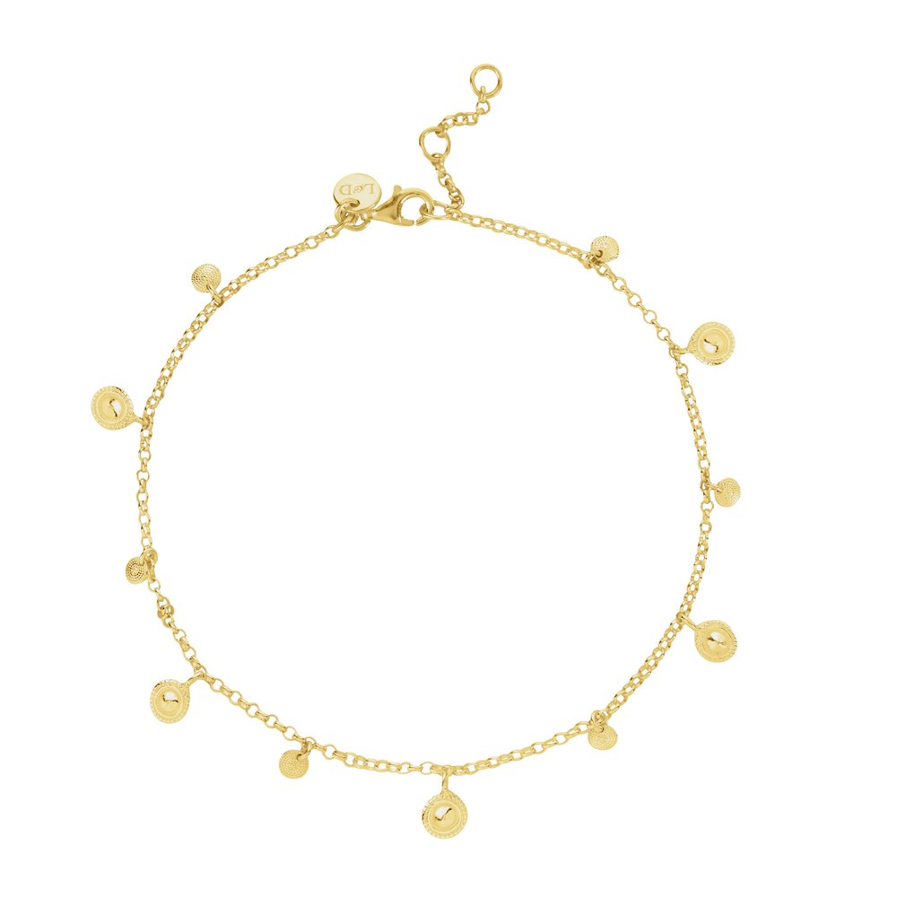 Dainty handcrafted coins in alternating size & design form our delicate Bopa anklet.