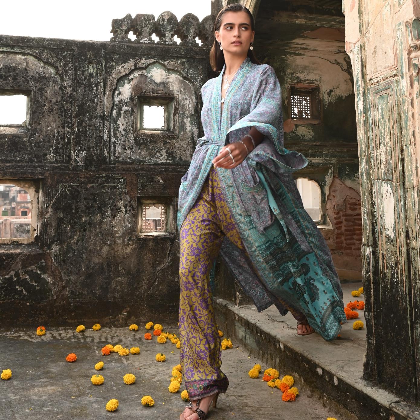 Now reimagined and co-created by empowered female artisans in rural India, our If Saris Could Talk Kimonos are lovingly created from pre-loved saris sourced from all corners of India, and hand-selected for their beautiful prints. Each kimono is one of a kind, no two are the same.