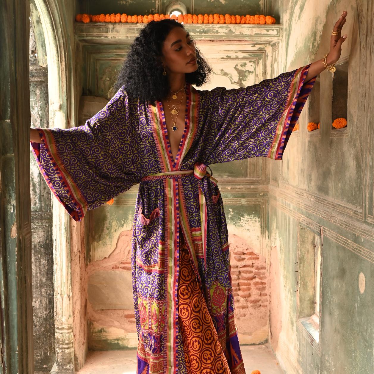 Each kimono is packaged in it’s own individual, hand-embroidered recycled sari drawstring bag, perfect for gifting to a loved one or to self.
